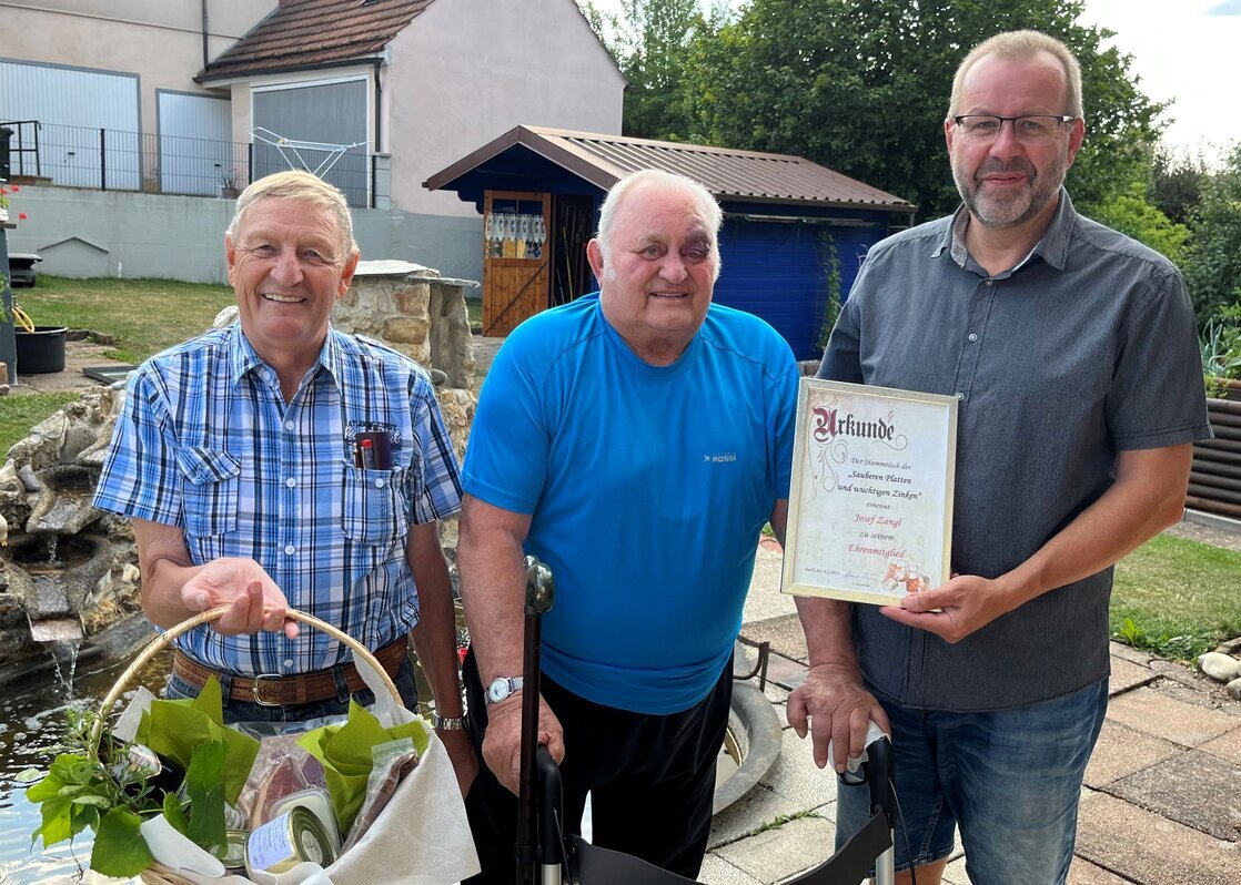 Obwohl Sepp an diesem besonderen Abend nicht persönlich teilnehmen konnte, wurde sein Beitrag und seine jahrelange Hingabe gebührend gewürdigt. Man lies es sich nicht nehmen, ihn nun nach so langer Zeit zum Ehrenmitglied zu ernennen. Am folgenden Tag überreichten Armin Kraus und Werner Kirschner im Namen der gesamten Stammtisches eine Urkunde zum Ehrenmitglied sowie einen herzlichen Geschenkkorb als Zeichen der Anerkennung und Wertschätzung für Sepps Engagement.
